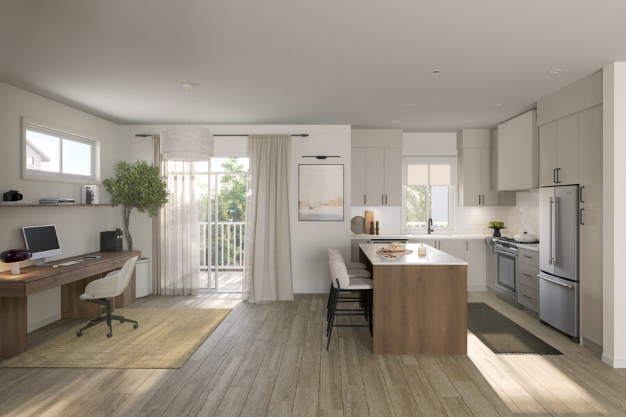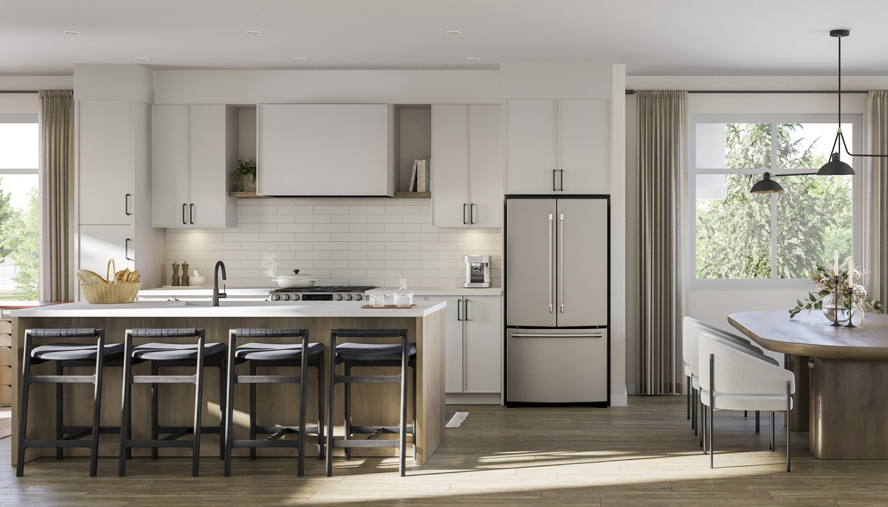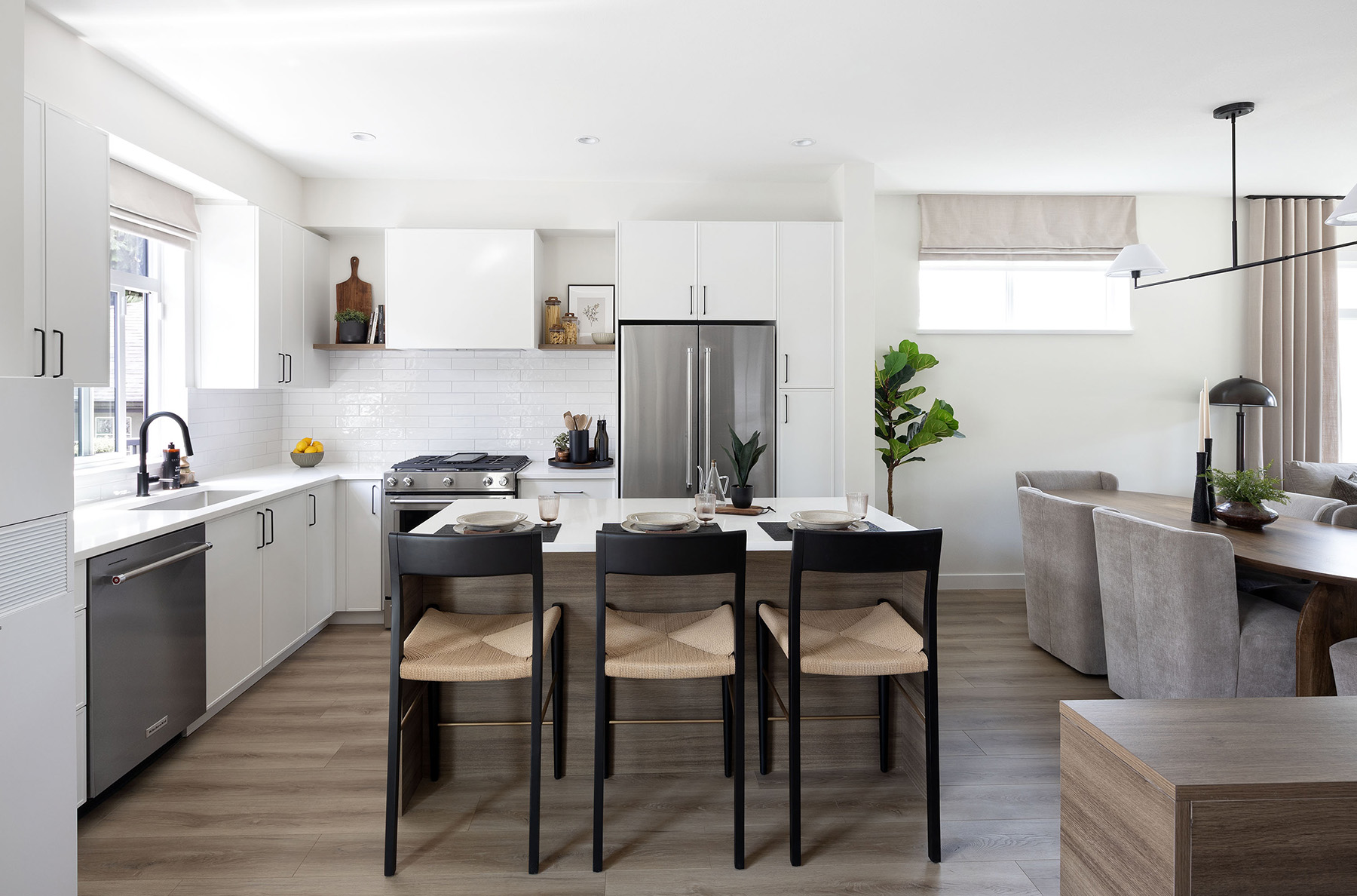 Here, classic charm meets contemporary living. These beautifully crafted townhomes feature a harmonious blend of warm red brick and soft grey siding, creating an elegant yet inviting streetscape. Clean lines, large modern windows and pitched rooflines add architectural interest and natural light, while welcoming front gardens offer a nod to traditional neighbourhood living.
