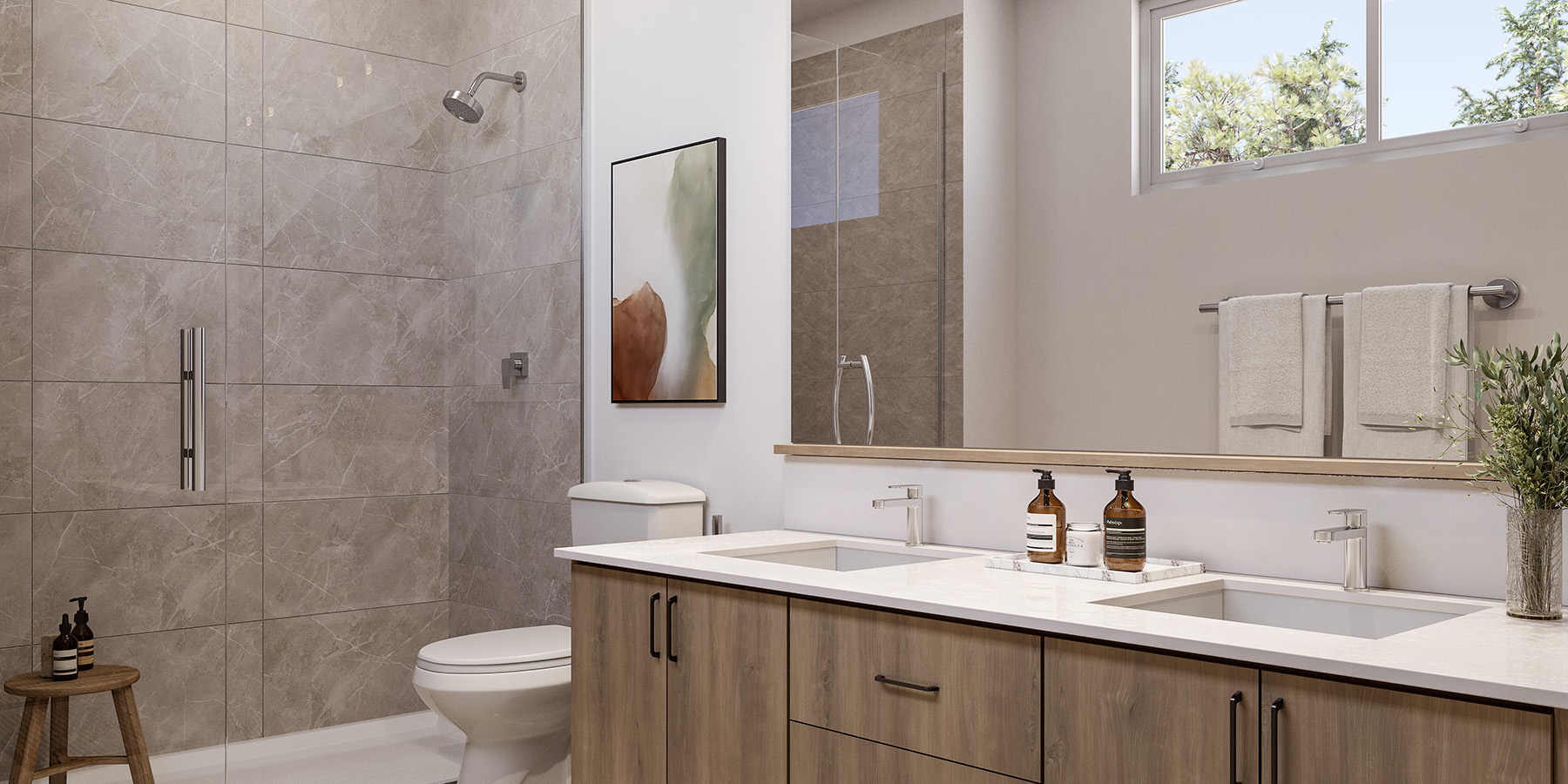 - 4 Flat-slab woodgrain vanities with generous drawer space